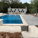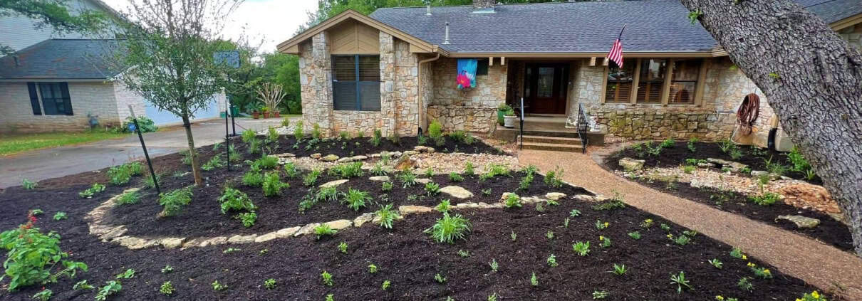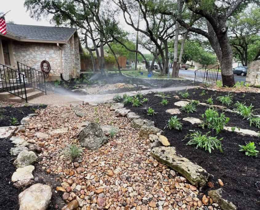 This Northwest Austin landscape renovation addressed chronic stormwater pooling along the front sidewalk while revitalizing an aging, sun-exposed yard. The removal of a mature Arizona ash had left the landscape bare and overheated, while invasive nandina and ligustrum dominated the remaining beds. The clients envisioned a native Hill Country aesthetic—lush flowering perennials nestled among limestone outcrops—and shared images to guide the design.
