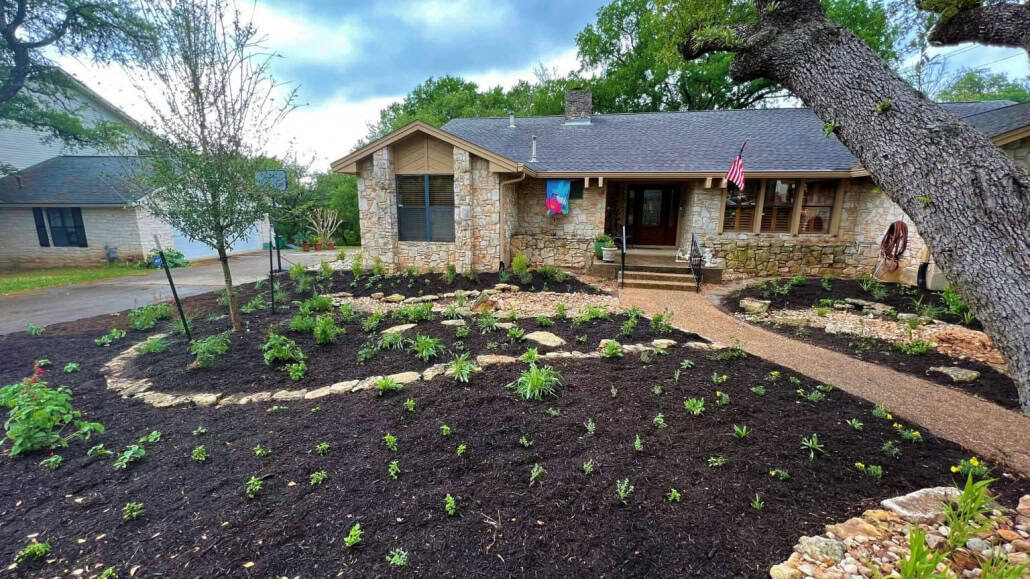 To further reduce maintenance, 1,905 square feet of St. Augustine turf grass were removed and replaced with mulched planting beds. The renewed landscape was planted with 640 native plants representing 29 species, creating a resilient, water-wise front yard that reflects the clients’ Hill Country vision while solving long-standing drainage issues.