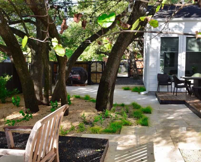 Emphasizing preservation, we repurposed existing limestone pavers into a permeable pathway surrounding the rain garden. This approach protected the mature oak trees’ critical root zones, minimized construction waste, and maintained natural water infiltration patterns.