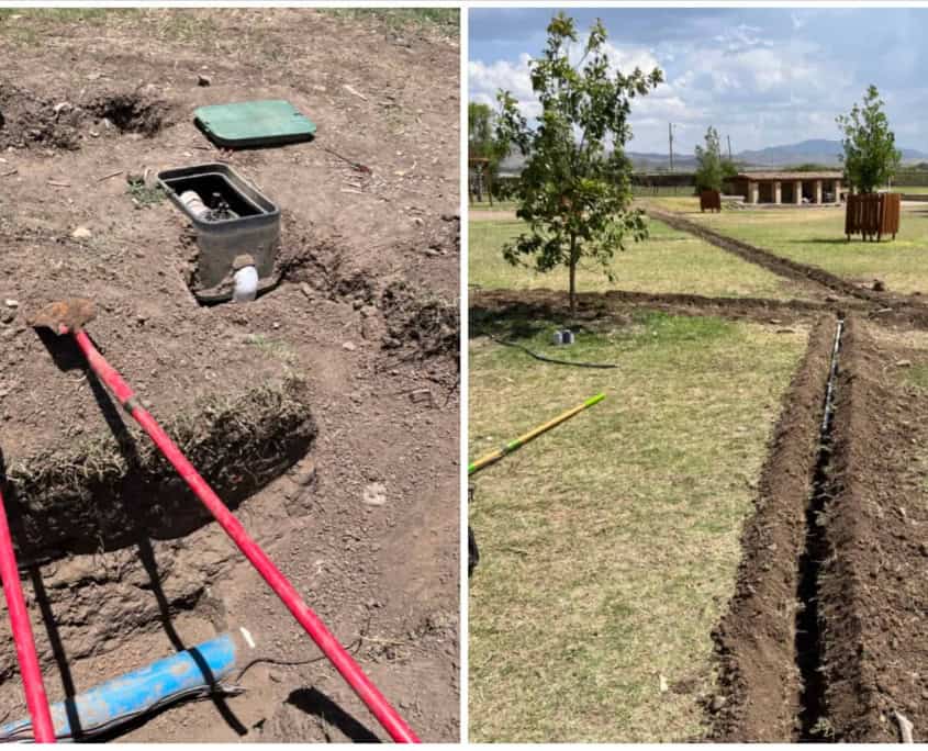 Sourcing compatible-sized PVC and valves from Odessa (a 90-minute drive away), the team got to work. Tasks included trenching to spec, boring underneath a concrete sidewalk, checking connections, and completing the new zone with componentry.