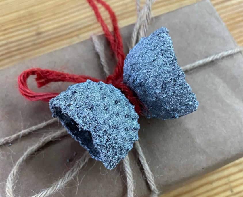 You can even dye your twine ribbon with Cochineal. You can collect this bright red dye from cacti, where you’ll see it as the white deposits on the plant. It’s one of the world’s oldest and strongest natural decorative dyes — which you can use if you’re not too grossed out by the fact that it’s the crushed bodies of parasitic insects!