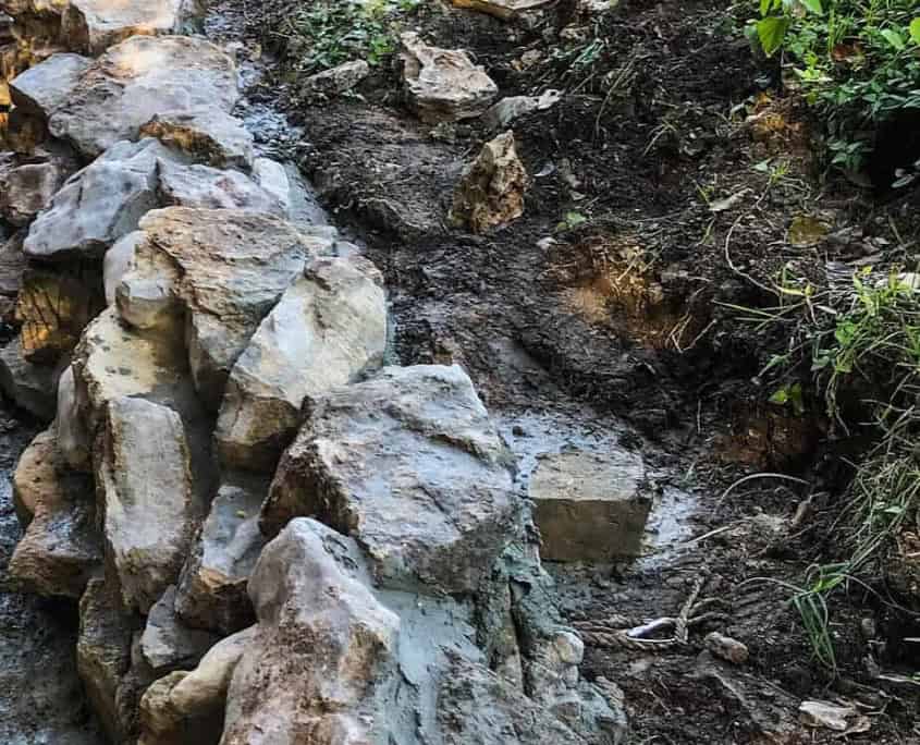 Because construction took place within an active urban park, the project required careful coordination to ensure the safety of both park visitors and crew members. The retaining wall was built using anchored cinderblocks as a structural base, reinforced with rebar, and finished with natural limestone to blend seamlessly into the park’s landscape.