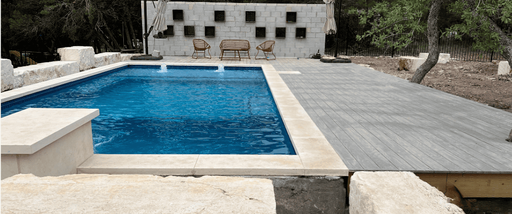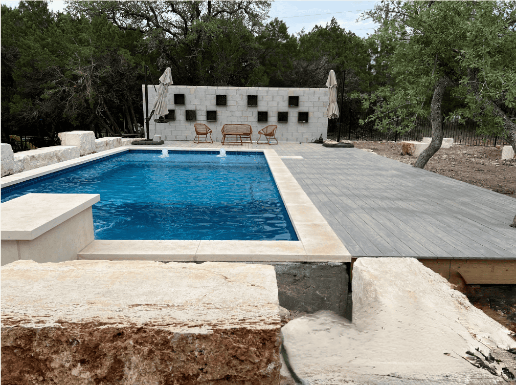 In addition, we constructed a CMU Wall on one side of the pool to provide privacy from the neighbors and support an Accoya wood deck. The CMU Wall was constructed with custom-welded steel cubbies to store towels and clothing for friends and family enjoying the new pool!