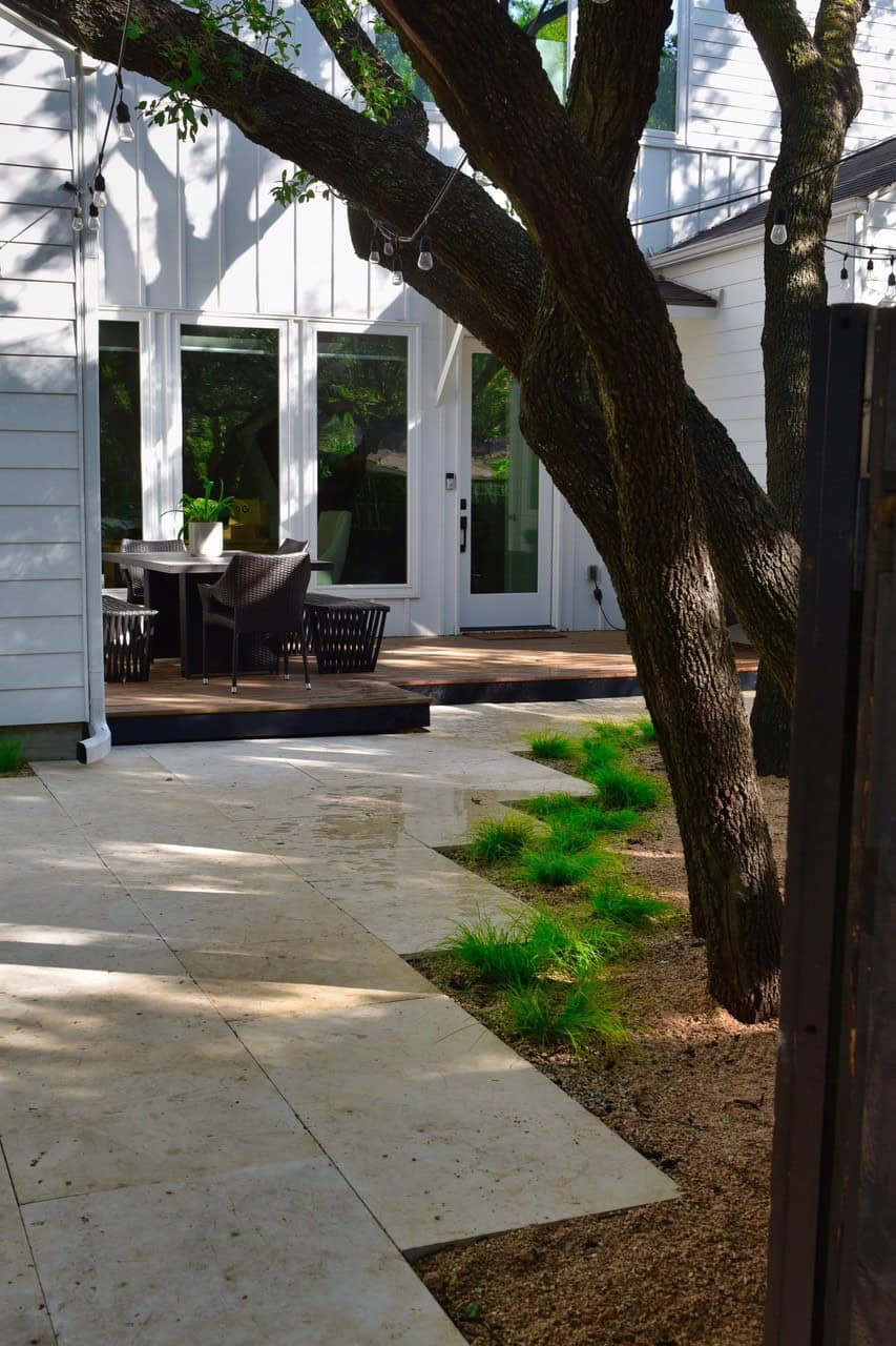 Our client approached us with a compact side yard, in need of a comfortable outdoor living area that also complemented their recently-built home. A multi-trunked live oak shaded the small space, which had minimal other plantings and a builder-grade wood deck. The overarching priority was to ease access for the client’s aging parents.